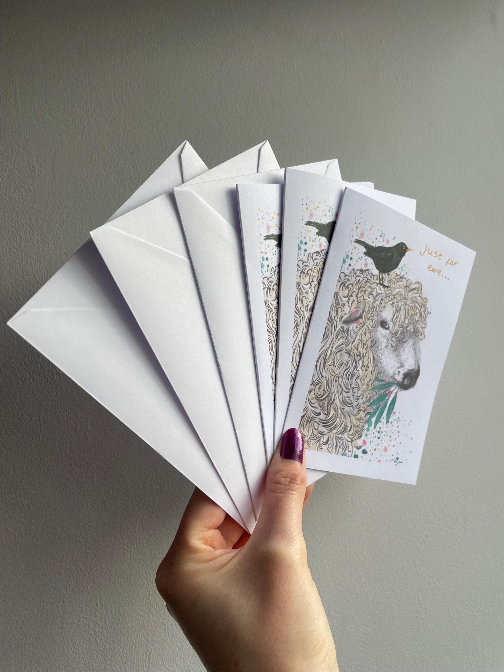 This comes in a pack of 3x A6 cards with 3x envelopes. The sheep and blackbird was drawn digitally with hand drawn gold details for extra sparkle.