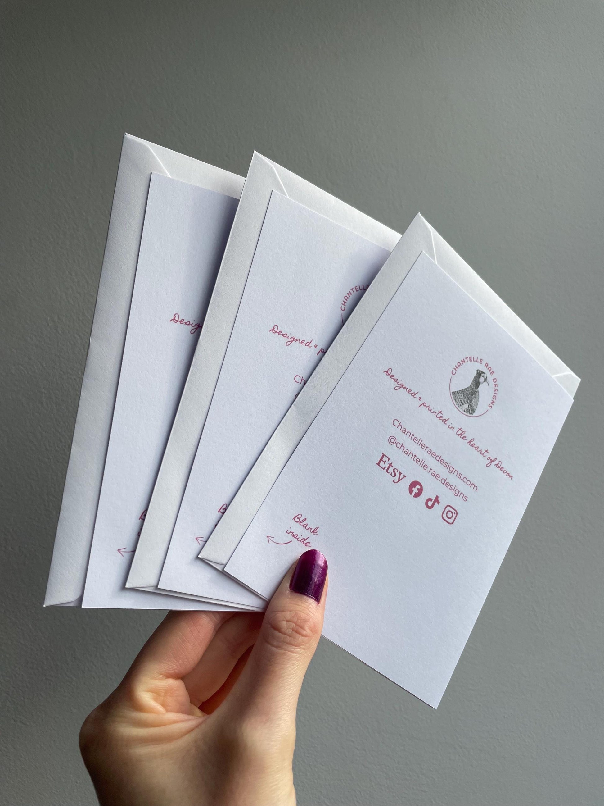 Printed in my studio based in the heart of Devon, UK, using a premium 6-ink printer on high-quality matt card.