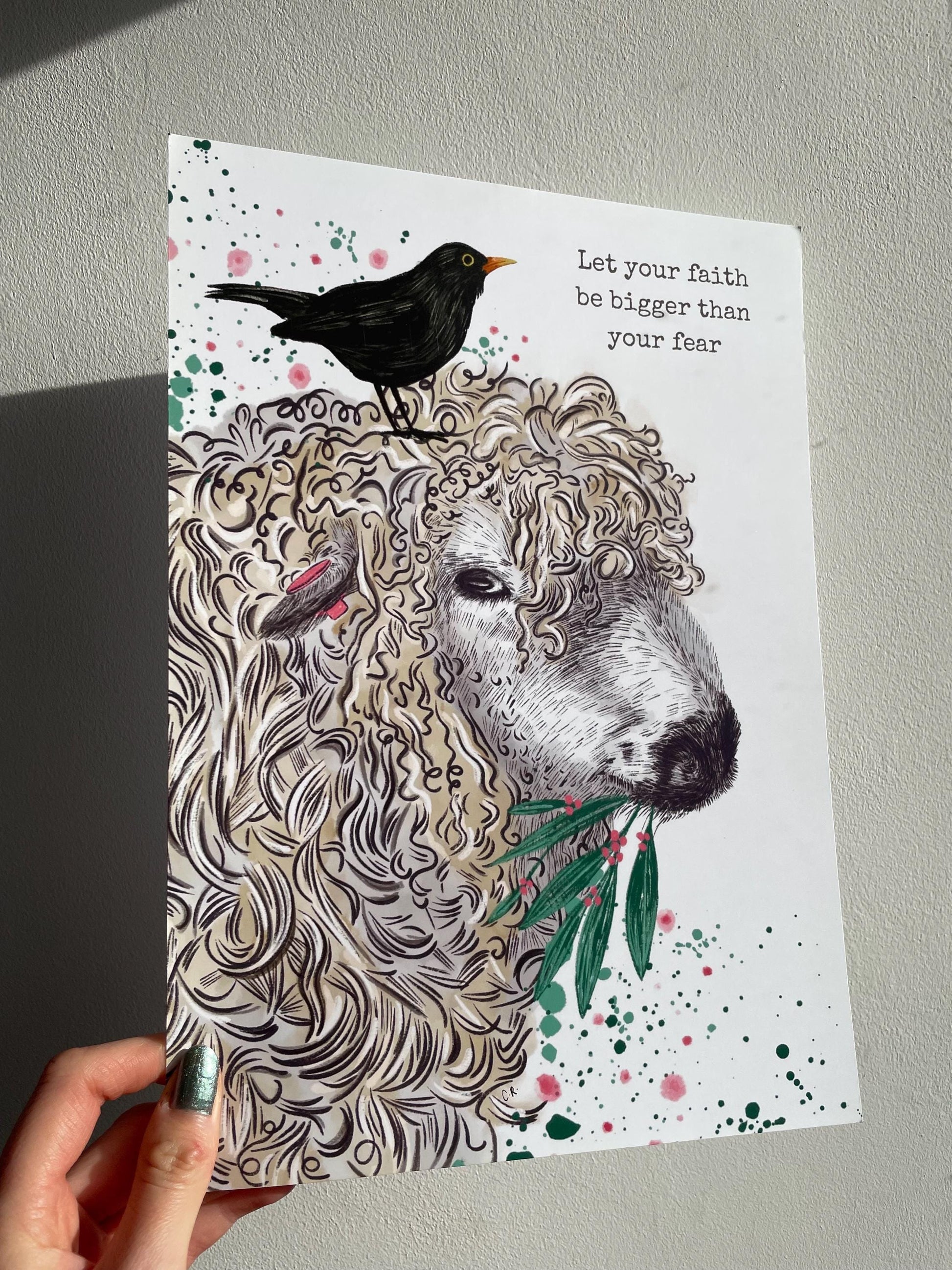 Sheep and Blackbird Art Print: Farmers, animal lovers, Signed A4 Glossy Print, FREE DELIVERY
